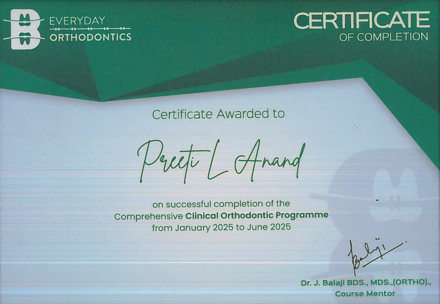 Dr. Keerthi Venkatesan is an orthodontist and a certified INVISALIGN provider. She is a member of Royal College of Physicians and Surgeons (Glasgow & England). She has extensive experience in treating simple to complicated malocclusions using Metal, Ceramic & self-ligating braces. She is dedicated to providing customized treatment plans that suit each patient’s needs. Her expertise ensures not just functional correction but also aesthetically pleasing smiles.